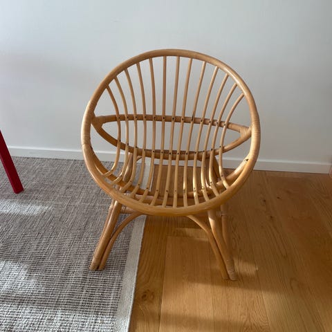 Lænestol i rattan / kurveflet. Stolen er købt brugt for nogle år siden. Har slitage i bunden foran som også kan ses på billedet. Hyndens betræk er hjemmehæklet i lyserød plys og kan udskiftes☺️ Skriv hvis du har nogle spørgsmål ! Kan afhentes på Lundtoftegade, København N