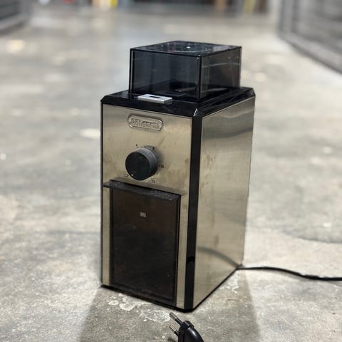 Cuisinart kaffekværn i rustfrit stål og sort plast. Udstyret med en beholder til malet kaffe og en digital skala på toppen. Designet til at male kaffebønner til frisk brygning.