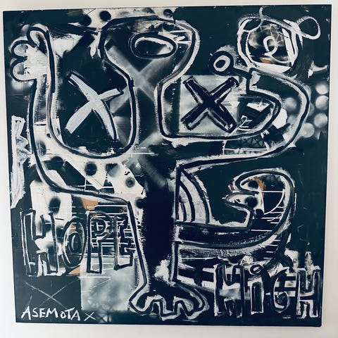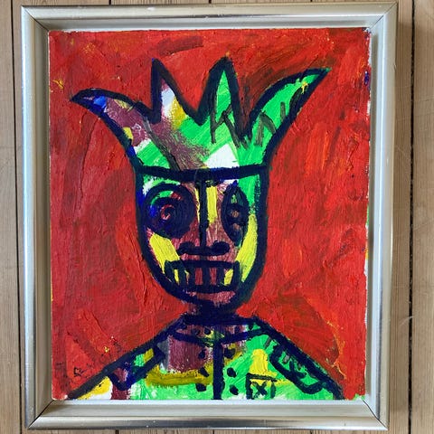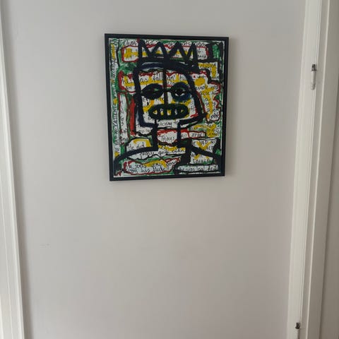 Abstrakt maleri med motiv af et ansigt i farverige nuancer, herunder blå, grøn, gul og rød. Malet af Sunny Asemota. Skal rettes i rammen. Mål inkl. ramme 76,5 x57cm.