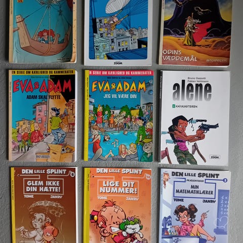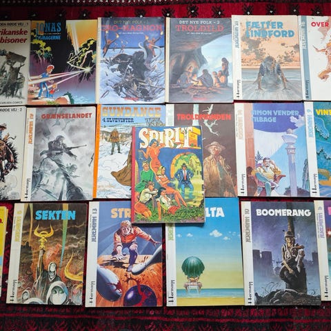 En samling af forskellige tegneserier med titler som Mad Super Special, Spirit, 1984, Charlies, Weird War, Adventure Comics, Tarzan, og flere. Tegneserierne varierer i genre og udgivelsesår, og de er i forskellige størrelser og farver. Samlingen indeholder både klassiske og nyere udgaver, primært i paperback-format.