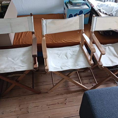 To stk hvide instruktør stole med beige lærteds betræk. Samlet salg.