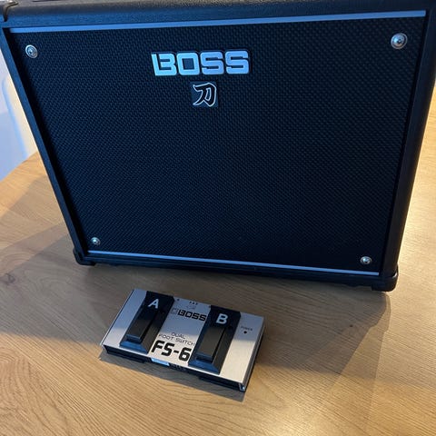Boss Katana 50 guitarforstærker med trådløs modtager. Sort farve og kompakt design med bærbar håndtag. Indeholder flere kontrolknapper til justering af lyd og effekter. Leveres med strømforsyning og modtager. Som ny. Kan sendes.