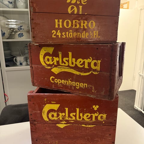 To plastik ølkasser med mærkerne Tuborg og Carlsberg.