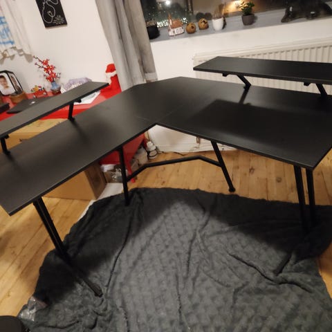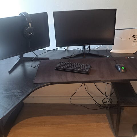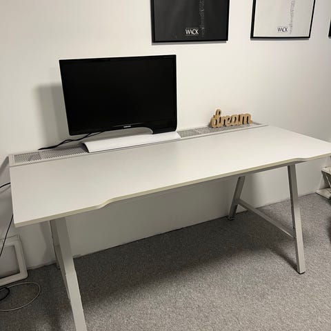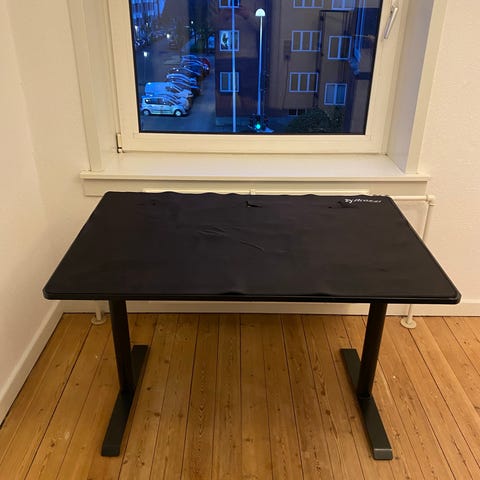 Dejligt stort gamer skrivebord med plads til hele setuppet. Der medfølger en musemåtte som fylder hele overfladen, den har en lille skramme på sig men ikke nogen som har en effekt på noget som helst brug med musen eller andet.
