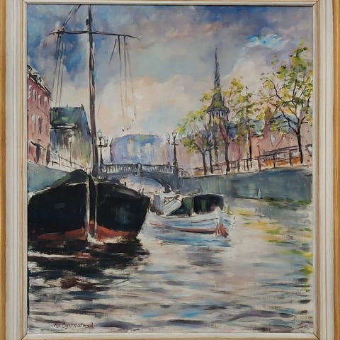 Parti fra Christianhavns Kanal ved Overgade Neden Vandet. Sign. Lis Bjergsted 74. Olie på lærred. 70×100.