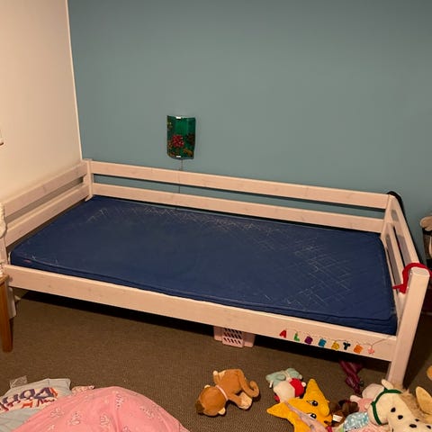 Skøn børneseng med 2 skuffer til fx legetøj. Flot seng med sengegavl. Sælges med madras, hvis ønsket.