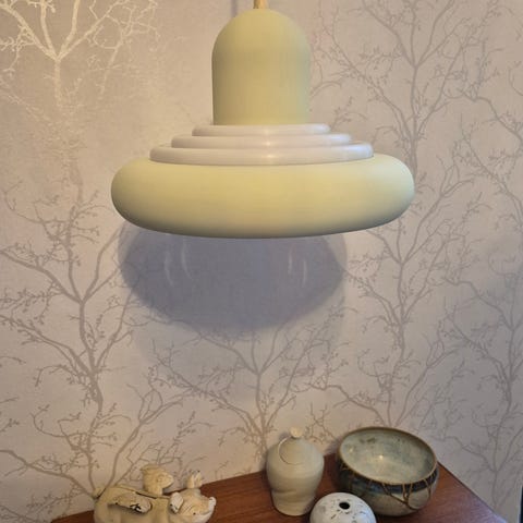 Ufo formet pendel designet af Knus Christensen for Lyskaer belysning i 70'erne. Lampen er udført af en kombination af metal og plast.