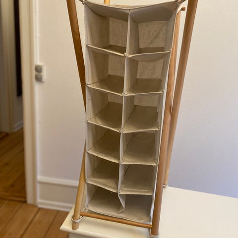 Lille hylde til skoopbevaring. Målene er ca. 90 cm * 34 cm. Rin stand. I sortmalet metal.