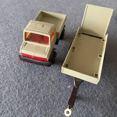 Detaljer: Modellen har en grøn førerhus, en lysegrøn chassis og en rød ramme til at holde de gule "plader".
