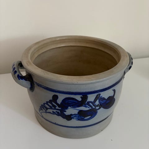 Mørkebrun syltekrukke, højde ca. 17 cm og diameter 14 cm, der forekommer brugstegn men ellers pæn og uden revner.