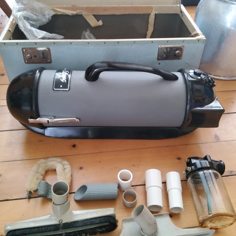 En gammel Nilfisk støvsuger som er lavet om til en m lampe