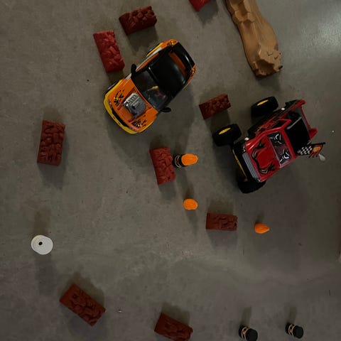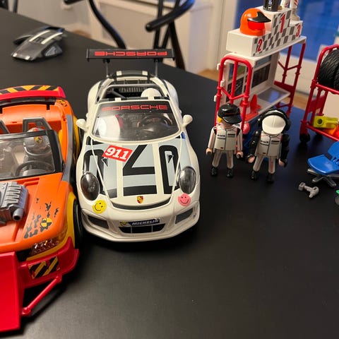 Pitstop på racerbanen med to racerbiler, olietønde, værktøj, donkraft, startflag og meget andet.