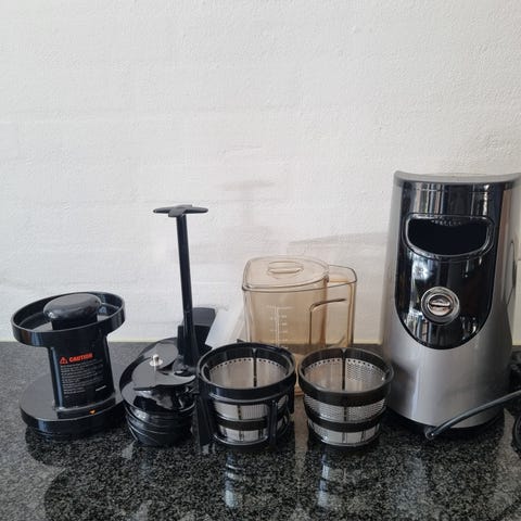 Inkluderer to beholdere til juice og pulp samt en presseudstyr til nem håndtering.