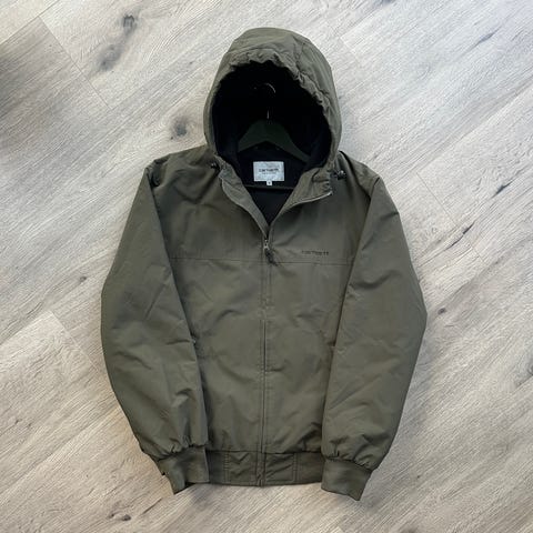 Carhartt Hooded Sail Jakke i størrelse M til mænd. Jakken er sort og fremstillet af 100% nylon med polyester foring. Den har hætte og lukkes med lynlås. Jakken er velegnet til udendørs brug.