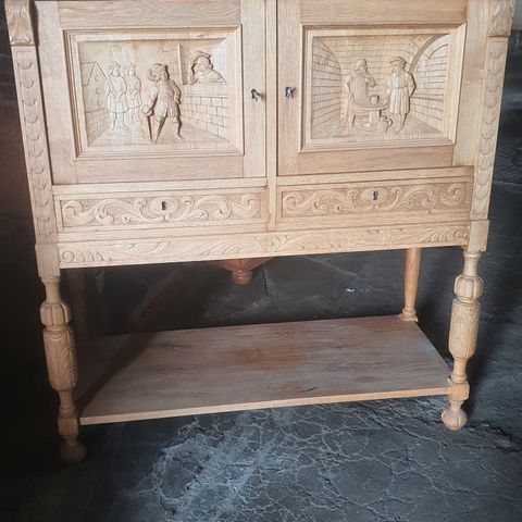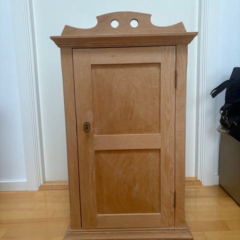 Træ sorten er mørkbejdset fyr eller eg. Den er sat sammen med dyvler/dudler som er af bøg eller birk. Skabet har en låge med metal stænger, der fungerer som gitter. Det har to hylder der har en længde på 23 cm og en dybde på 10 cm og der er 13 cm mellem hver hylde.