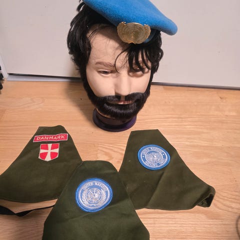 United Nations baret hue i størrelse 7 1/2. Fremstillet af ren uld med blå farve. Huen har det karakteristiske FN-emblem foran og sort indvendigt foer. Designet til at blive båret som del af FN-uniform eller til samlerbrug.