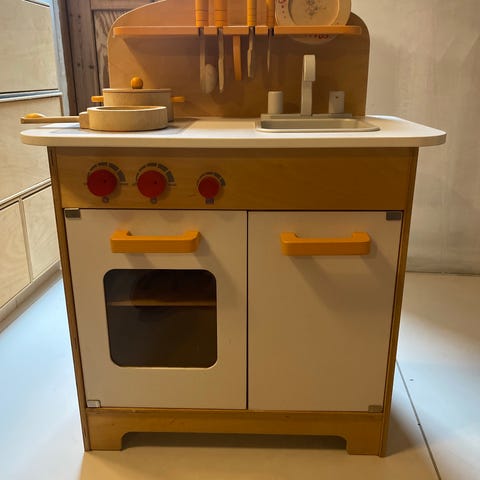 Trækøkken fra Hape. To kogeplader, ovn, vask og skab. Vi har også køkkenredskaber (se anden annonce). Mål: 32x55X50 cm