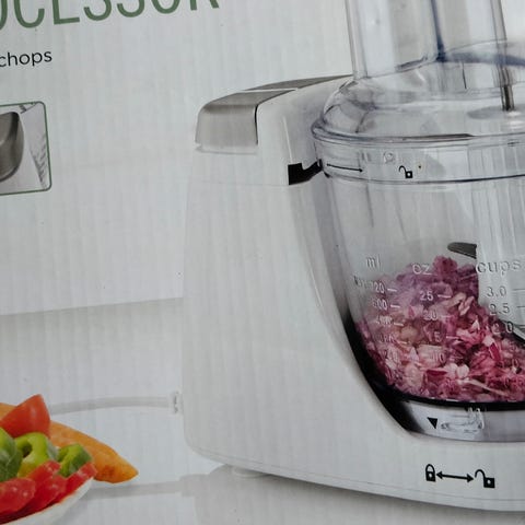 Point Food Processor med tilbehør, herunder ekstra kande og brugervejledning. En køkkenmaskine designet til at hakke, blande og forberede madvarer. Enheden har en rustfri stålbase med kontrolknap og gennemsigtige plastbeholdere.