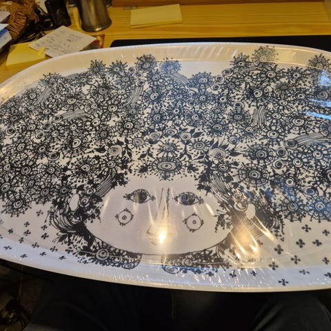 Fint gammelt fad fra Bjørn Wiinblad. Oprindeligt lavet af Bjørn Wiinblad til Illums bolighus. Kvadratisk og er 40 x 40 centimeter øverst og 30 × 30 cm i bunden.