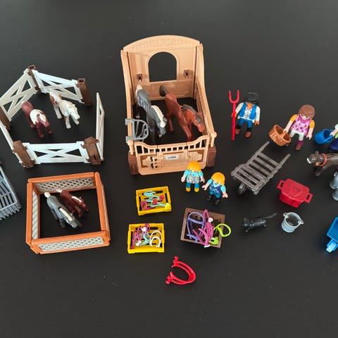 Heste, ponyer, føl, voksen rytter, barne rytter, spring, hegn, seletøj, striglekasser, sadler og skridttæppe.