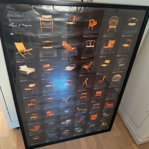 Wegner 100 År plakat med illustrationer af forskellige stole designet af Wegner. Plakaten er i sort og hvid og viser en række stole i forskellige designs og stilarter. Passer til ophængning som vægdekoration i hjem eller kontor.
