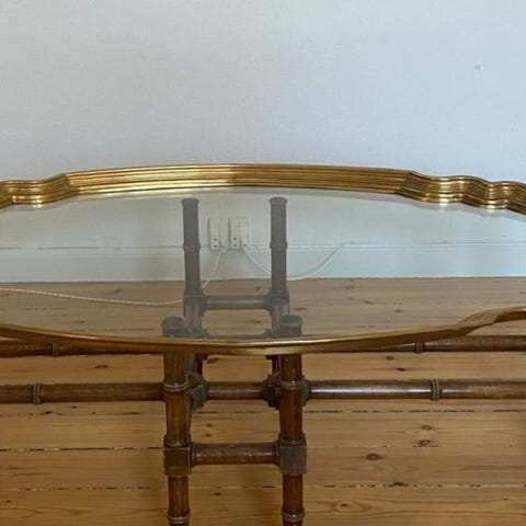 Glaspladen hviler på en art deco inspireret messing opsats monteret på en marmorfod. De to bærende dele har enkelte, men meget lette brugsspor.
