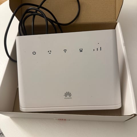 Huawei B525 4G Router i hvid farve. Routeren understøtter LTE Cat 6 og har porte til Ethernet, USB og SIM-kort. Den leveres med strømforsyning og brugervejledning. Modellen er designet til trådløs internetforbindelse med Wi-Fi standard 802.11ac.
