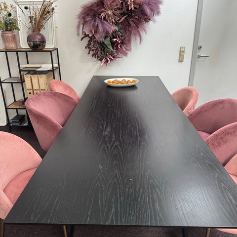 Spisebordet er en tyk træplade, som er belagt med micro cement med HAY bordben på (HAY loop stand Frame)