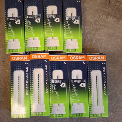 OSRAM Dulux S lyskilde med en effekt på 7 watt og lysstyrke på 400 lumen. Passer til G23 sokkel. Produktet er designet for belysning med lavt energiforbrug. 20 kr pr stk. Har 7 stk alt.