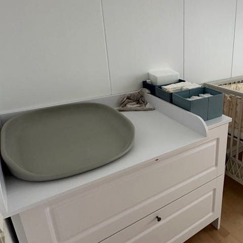 IKEA puslebord designet til babyer, med to skuffer og en åben hylde til opbevaring. Fremstillet i flot beige materiale med runde knopper og ben i træ. Mål: 85 cm bredde, 79 cm dybde, 97 cm højde. Velegnet til opbevaring og pusling af små børn. Meget funktionel.