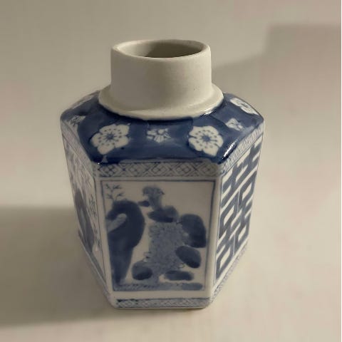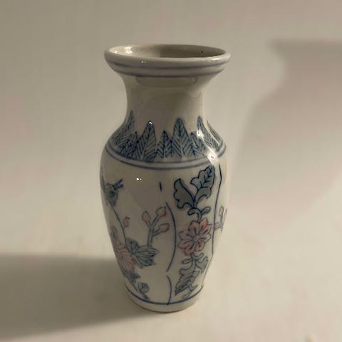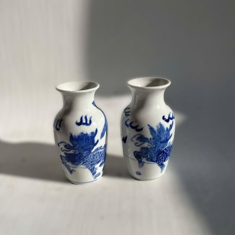 Antik Kinesisk Fanghu porcelænsvase. Håndmalet i blå/hvid med landskabsmotiv