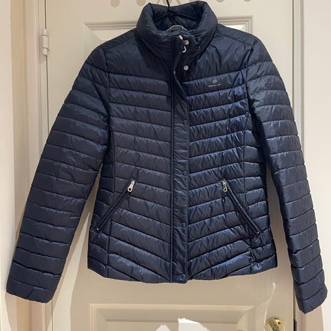 Gant dunjakke i mørkeblå med navy logo-print samt logo på venstre skulder. Str. L. Kan strammes ind i bunden. Har to yderlommer og en inderlomme. Virkelig flot og sælges kun, da den desværre er for stor til mig. Brugt meget få gange, helt som ny. 100% polyester. 90% dun, 10% fjer. Style: D2. Jacquard Gant Word Down Jacket. Farve: Evening blue. Nypris: 3800kr