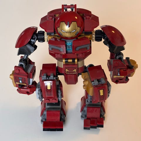 Alle dele medfølger, dog mangler gennemsigtig klods så Iron Man kan hoppe. Brugt men god stand.