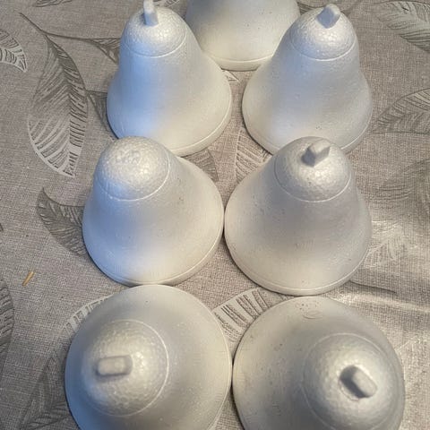 3 ringe : ca ø24. - 3 ringe ca ø 17 - 3 klokker - 1 stjerne ca ø 18 - 3 “ diamanter “ længde 16cm og et lille hjerte 14 dele i alt 65kr