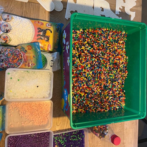 Hama Børneperler i en stor gennemsigtig plastikbeholder med blandede farver. Perlerne er lavet af plast og egner sig til kreative børneprojekter og håndarbejde.
