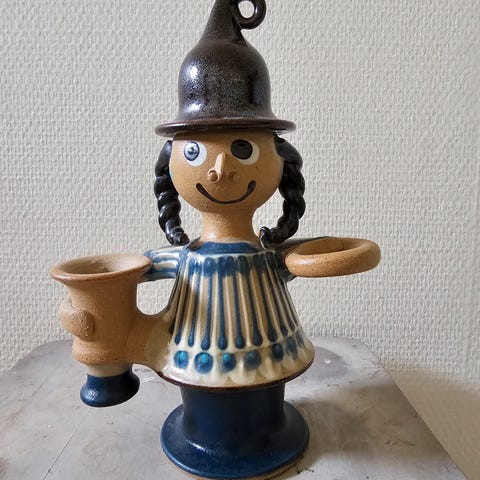 Stentøj nissefigur fra Heerwagen keramik. Nissepigen er med en fin lille fugl.