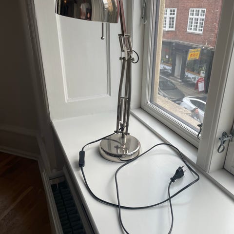 Sølvfarvet bordlampe til salg. Elegant og tidløst design, passer perfekt til kontor. Giver et behageligt og varmt lys. God stand.