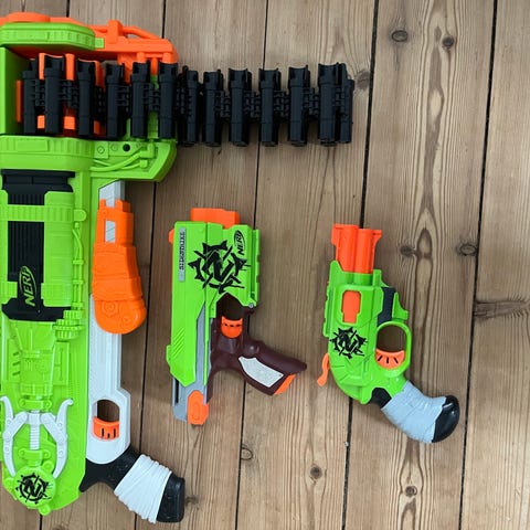Nerf Zombie Strike Dart Blaster i grøn og orange farve med gråt skudsikringsudstyr. Legetøjsblaster til børn, designet til at affyre skumdarts. Egnet til udendørs og indendørs leg. Uden skud.