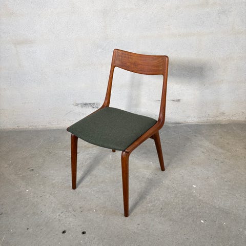 Alfred Christensens Boomerang Stole er kendt for deres karakteristiske design, der omfavner både funktionalitet og æstetik. Deres rene linjer og strømlinede form gør dem til et tidløst indslag i ethvert spisestuemiljø, samtidig med at de udstråler en unik vintage-charme. Disse stole er et vidnesbyrd om den enestående arv af dansk møbelkunst.