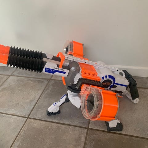 Nerf N-Strike Elite håndholdt skumdart pistol i orange farve. Fremstillet af plastmateriale, designet til børn. Pistolens størrelse og lette vægt gør den egnet til leg og udendørs aktiviteter. Uden skud.