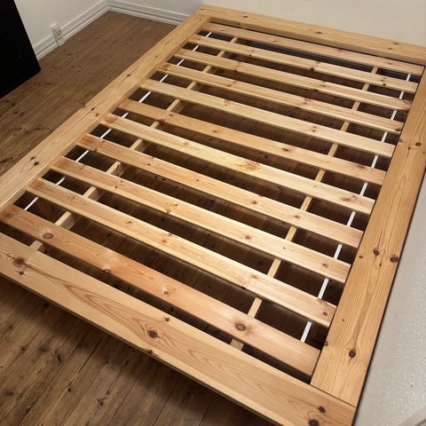 Læderstropper holder ryggen sammen. Kan foldes ud så man ligger dejligt på de to madrasser.