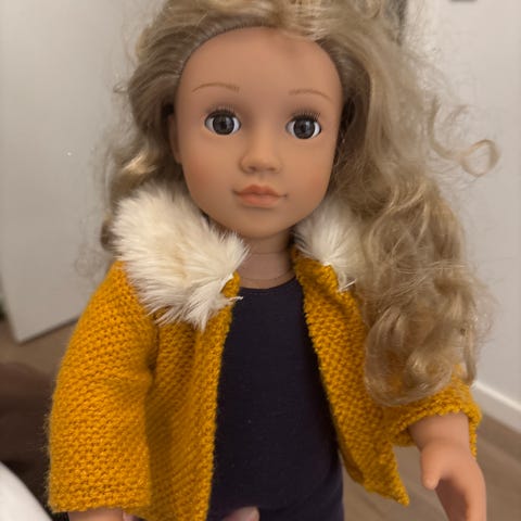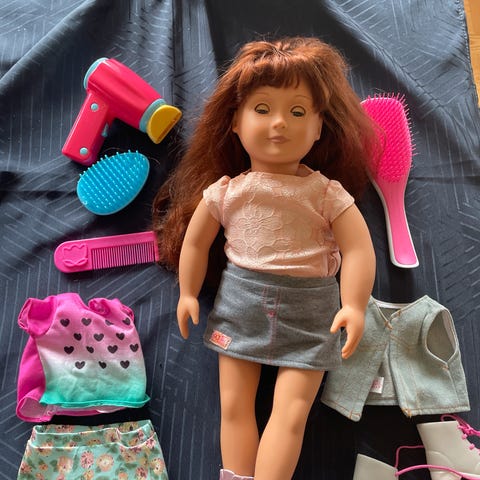 Super sød og fin Our Generation dukke med langt hår, som vokse sig længere. Sættet inkluderer også forskellige tilbehørsdele som en blå kuffert, ekstra tøj, hamster med legetøj m.m.