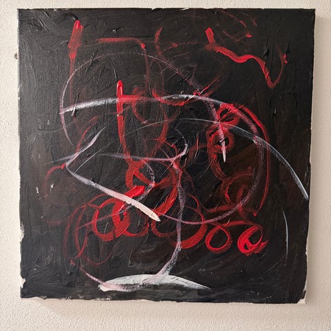 M. Mads Maleri Abstrakt Maleri med en farverig komposition bestående af blå, grøn, rød, gul og hvide nuancer. Maleriet indeholder dynamiske penselstrøg og drip-effekter, signeret af kunstneren M. Mads i nederste hjørne.
