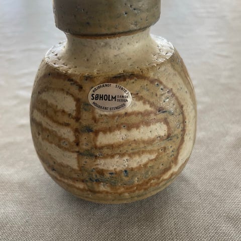 Stentøj vase i hexagonal form fra Søholm designet af Jaicko Nietzsche. Fremstillet i keramik med en brun og beige glasur. Vasen har en tekstureret overflade og måler cirka 12 cm i højden. Velegnet til dekorative formål i hjemmet.