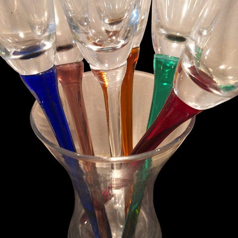 Unik og dekorativ glaskrukke med 6 champagnefløjter i klar glas med farvede stilke. En både funktionel og skulpturel genstand, der pynter flot i stuen, vitrinen eller på barvognen. Glas i blå, grøn, lilla og sorte nuancer.