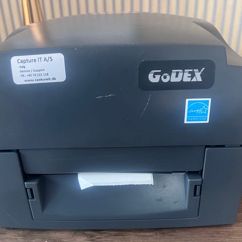 GoDEX ZX420i termo/ termisk labelprinter med model ZX420i. Printeren bruger termisk teknologi og har input power AC 100V-240V, 50-60Hz, 1.5A. Serienummer JH17AV200700057. Medfølger ruller af termiske labels til brug med printeren.