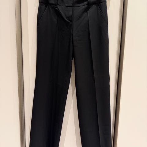 Hugo Boss bukser i sort farve, størrelse 38 til kvinder. Bukserne har en satinlignende detalje langs siden og lukkes med lynlås. Materialet fremstår glat og egnet til formelle eller semi-formelle lejligheder.