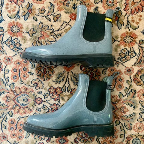 Lemon Jelly sorte gummistøvler i str. 38 (små i størrelsen). Spidse i snuden og ellers i chelsea-støvle look. Virkelig gode at gå i, desværre bare for små til mig. Indlægssålen er 24 cm lang, men det er helt ud til spidsen. Brugt få gange, har lidt brugsspor udvendig.