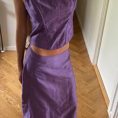Skøn, lang lyslilla gallakjole, købt hos Bride Fashion i Virum. Består af en top og en nederdel, hvilket gør, at den sidder meget klædeligt. Er foret.