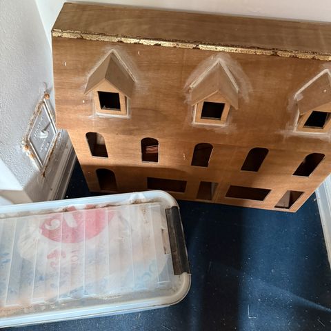 Jeg sælger mit dukkehus med tilhørende købmands butik 1:12 incl alt inventar sælges med. Der er lavet loft lys i selve dukkehuset som kører på batteri